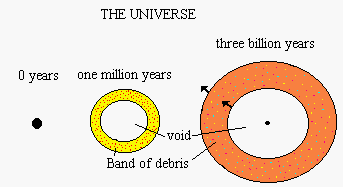 One million years later, the material from the explosion was still moving further away from the center point of the explosion but, as the gases began to cool, some of the elements began to gather together, starting the process of forming stars. Because of this interaction, the speed at which some particles were moving away from the explosion point would naturally slow down, while other particles of matter would continue traveling away from the explosion point at the same rate as before. This would then create a continually widening band of matter which would have two edges - the farthest, outer edge, beyond which there is nothing except totally empty space, and the inner edge, which is the closest edge to where the big bang first took place. Behind this inner edge there would also be a void because everything is moving farther and farther away from the point of explosion.