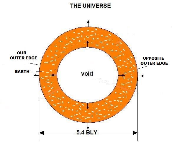 But there's a third and more fundamental problem with the Big Bang theory. As we saw with our explosion time line, there has to be a large area in the center of the universe that is devoid of matter. If this void doesn't exist then that means matter shot out of the Big Bang with a tremendous explosive force but some of it suddenly stopped its forward movement and remained in the center. However, such a hypothesis defies the laws of known physics. Therefore, such a void has to exist. Yet, with all the peering into space that we've done, no one has ever mentioned seeing a large area within the universe that is without matter. More than that, even with the aid of our most powerful telescopes that can see galaxies 12 BLY away, no one has ever been able to discover where the outer edge of our universe is. Instead, no matter in which direction we look we keep discovering galaxies beyond galaxies. As such, we have never been able to find "the edge of the universe."