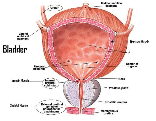 However, a very short distance from the bottom of the bladder, there is another muscle that surrounds the urethra that is called the external sphincter. In addition to this, in men there is a gland called the prostate that sits between the inner sphincter at the bottom of the bladder and the top of the external sphincter, through which the urethra passes.