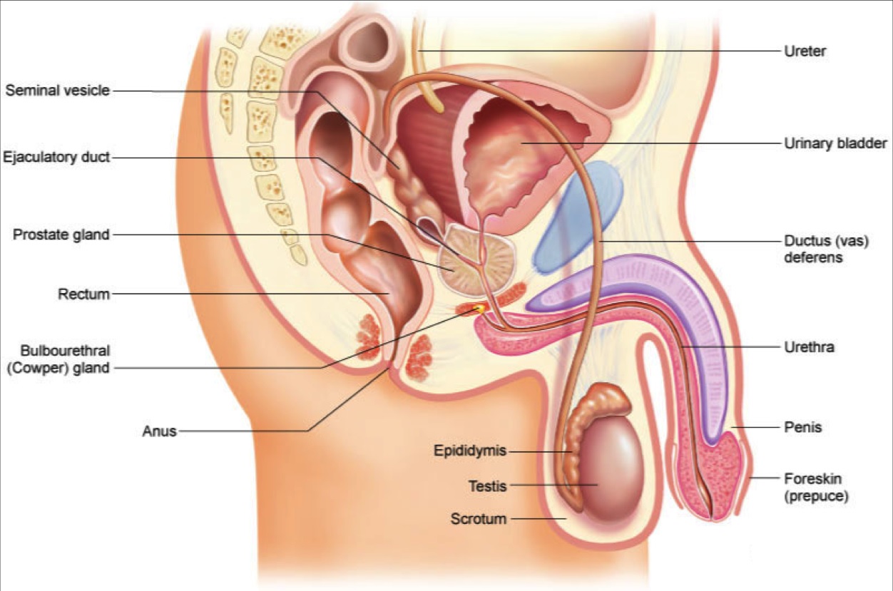 The hormone testosterone produces several effects in the male body having to do with sexual activity, one of which is to signal the release of the sperm stored in the testis. When the sperm is released it travels through a tube called the ductus deferens which goes up and over the front of the bladder, then drapes over the back of the bladder where it enters into the prostate.