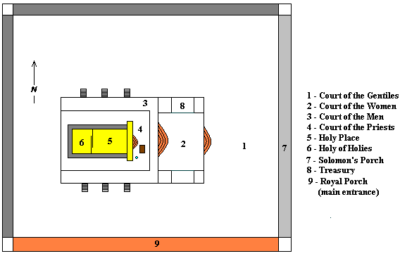On the western side of the Court of the Women were fifteen steps that led up to yet another enclosed courtyard known as the Court of Israel where only Jewish men were permitted to enter. These men could also enter this courtyard from the Court of the Gentiles through doors located on both the north and south sides of the temple. However, the Court of Israel had its bounds because beyond this section only the priests were permitted. This area was known as the Court of the Priests and is where the sacrificial animals were clean, prepared, and burnt on a large altar that measured thirty six feet square and stood fifteen feet high. Next to this altar of sacrifice were twelve steps that led up to the actual temple itself . While the men of Israel were permitted to watch the outdoor sacrifices being performed, no one but the priests were allowed to go inside the House of the Lord and only the High Priest was permitted to go into the holiest place inside the temple.