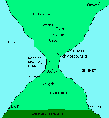 At the southern end of the narrow neck of land was the city of Bountiful. South of there was the city of Joshua, which was situated near the west sea. Further south was the city of Angola and Zarahemla was south of there.